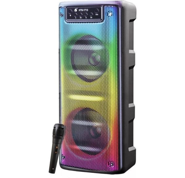 اسپیکر بلوتوثی قابل حمل KTS-1711 معرفی شده در سال 2023 از سوی کمپانی BIG SOUND مدل بهینه و به روز شده اسپیکر پر فروش و پر طرفدار KTS-1296 از همین برند می باشد که با توان خروجی 10 وات و ظاهر شیک و جدید و زیبا یکی از بهترین گزینه ها برای لذت بردن از موزیک می باشد. این اسپیکر دارای دو باند 3 اینچی و دارای رقص نور بهینه و جدید و حالت اکولایرز می باشد که هنگام پخش موزیک زیبایی دو چندانی به اسپیکر میدهد. پشتیبانی از کارت حافظه و فلش مموری ، بلوتوث ، ورودی AUX و قابلیت اتصال میکروفن از ویژگی های این اسپیکر قدرتمند می باشد . و قابلیت TWS نیز به شما این امکان را می دهد که با خرید دو دستگاه از این مدل آنها را جفت سازی کرده و همزمان از دو اسپیکر از طریق بلوتوث بخش صدای استریو را دریافت کنید . با این امکان به راحتی می توان یک مهمانی و و یا یک جشن تولد را پوشش داد .