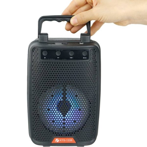 این اسپیکر بسیار سبک است و فقط 300 گرم وزن دارد. ظاهر اسپیکر KTS-1338 شیک و مدرن است. شکل استوانهای با روکش صاف و براق دارد. این اسپیکر جمع و جور و قابل حمل است که حمل آن را آسان میکند و این برای ورزشکاران بسیار مفید است. طراحی ساده و شیکی دارد که برای مجالس مختلف مناسب است. رقص نور LED حس سرگرمکننده و بازیگوشی را به کاربر میبخشد و آن را برای مهمانیها و مجالس شگفتانگیز میکند. به طور کلی، اسپیکر KTS-1338 یک دستگاه شیک و کاربردی است که صدایی با کیفیت بالا و تجربه کاربری عالی را ارائه میدهد. این اسپیکر یک دستگاه بلوتوثی جذاب همراه با رقص نور با قدرت صدای باس مناسب میباشد. این اسپیکر با دارا بودن محل قرارگیری دست جهت حمل و همچنین سطح نگهدارنده تلفنهای همراه آن را به یک دستیار صوتی کوچک اما پرکاربرد برای استفاده های روزمره تبدیل کرده است.